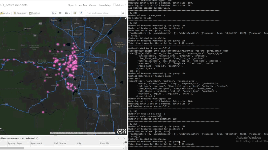 With the Colorado State Team Awareness Kit (COTAK) program gaining significant adoption in 2024 and member agencies increasingly seeking to host their own situational awareness dashboards, a clear need emerged to expose Computer-Aided Dispatch (CAD) incidents and Automatic Vehicle Location (AVL) data within a geospatial environment. At Jeffcom911, CAD data is maintained in a SQL Server database that does not provide a native API for integration with ArcGIS Enterprise or ArcGIS Online. In parallel, real-time AVL data is broadcast through a NATS message broker rather than a traditional REST service. To meet operational demand, a custom geospatial integration workflow was designed to bridge these systems.